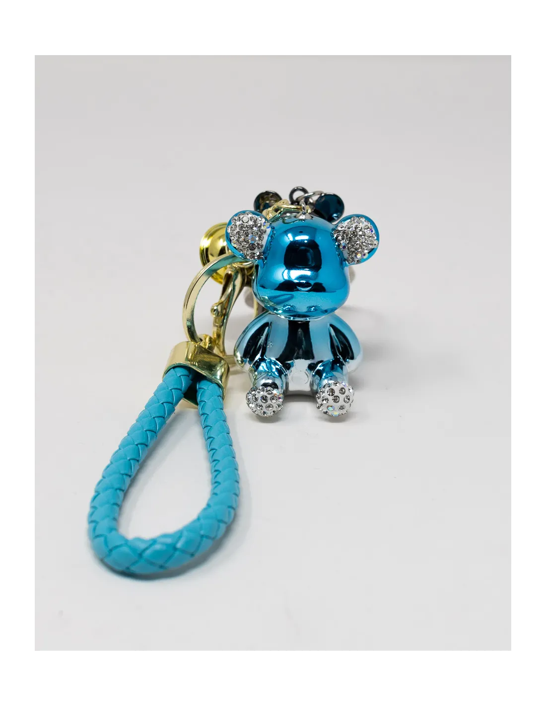 Porta chiave a forma di orsetto. Disponibile in 6 colorazioni diverse, con strass. Ciondolo e campanello. Altezza 18cm.