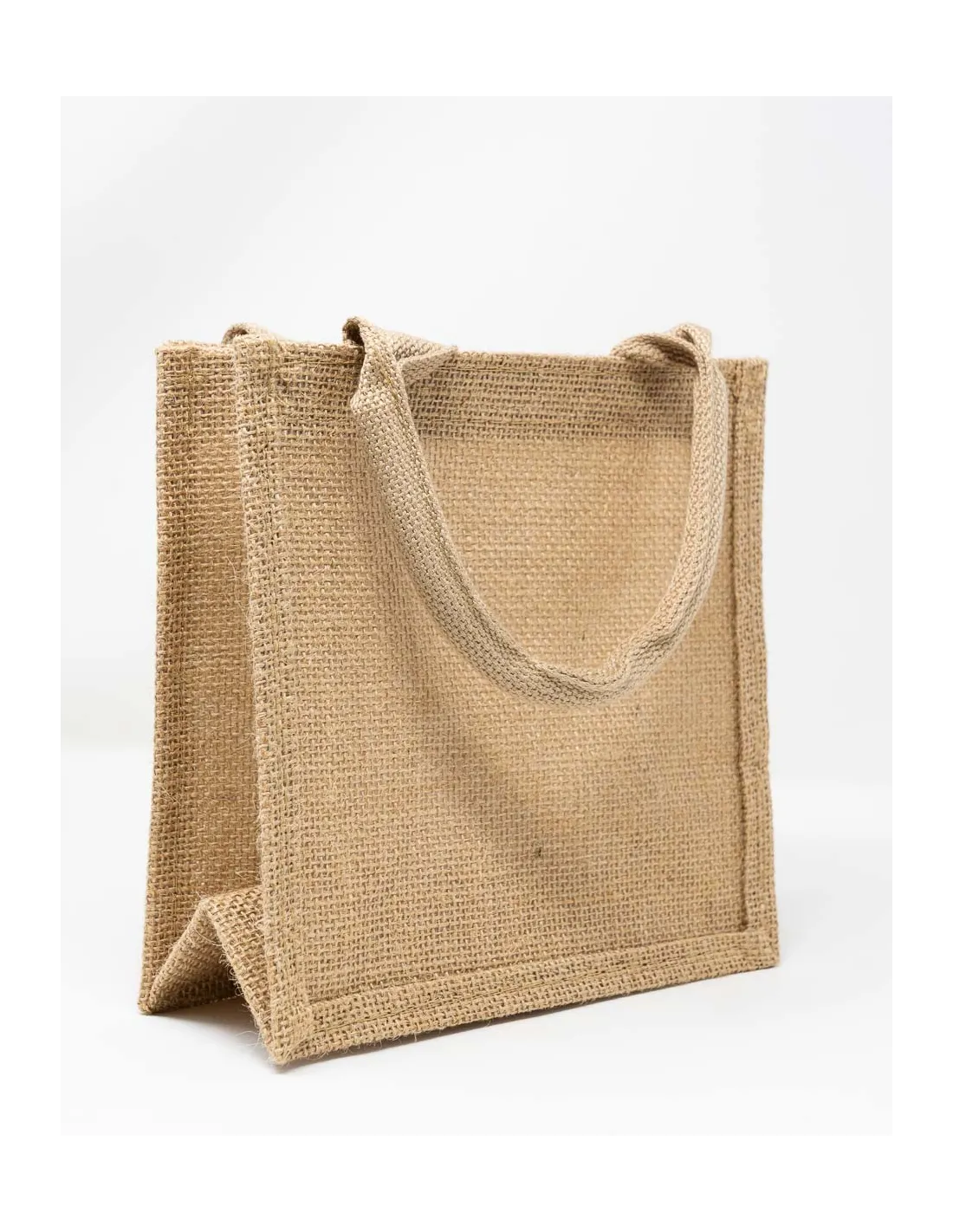 Borsa di iuta. Misure: altezza 20cm, largezza 20cm, spessore 11cm. Colore juta naturale. Confezioni da 1 pezzo.